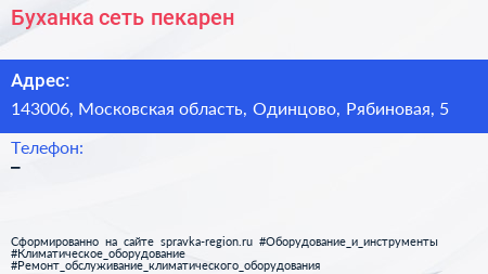 Буханка, сеть пекарен по адресу 143006, Московская область, Одинцово, Рябиновая, 5 в дальнейшем Организация, размещена в следующих категориях: