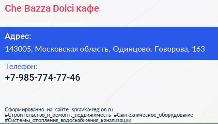 Che Bazza Dolci, кафе по адресу 143005, Московская область, Одинцово, Говорова, 163 в дальнейшем Организация, размещена в следующих категориях: