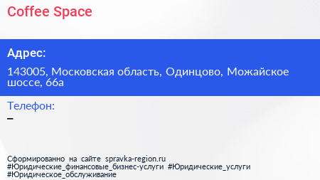 Coffee Space по адресу 143005, Московская область, Одинцово, Можайское шоссе, 66а в дальнейшем Организация, размещена в следующих категориях: