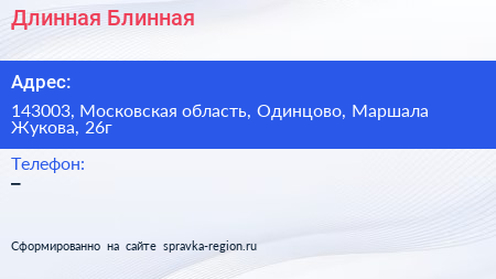 Длинная Блинная по адресу 143003, Московская область, Одинцово, Маршала Жукова, 26г в дальнейшем Организация, размещена в следующих категориях: