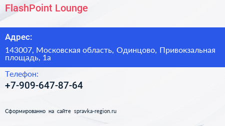 FlashPoint Lounge по адресу 143007, Московская область, Одинцово, Привокзальная площадь, 1а в дальнейшем Организация, размещена в следующих категориях: