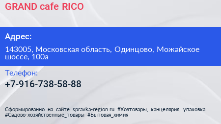 GRAND cafe RICO по адресу 143005, Московская область, Одинцово, Можайское шоссе, 100а в дальнейшем Организация, размещена в следующих категориях:
