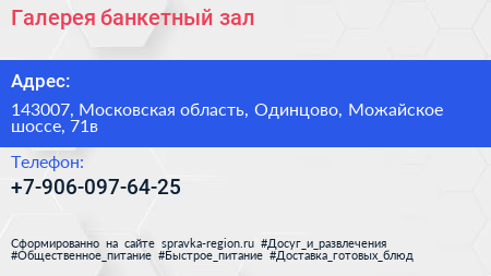Галерея, банкетный зал по адресу 143007, Московская область, Одинцово, Можайское шоссе, 71в в дальнейшем Организация, размещена в следующих категориях: