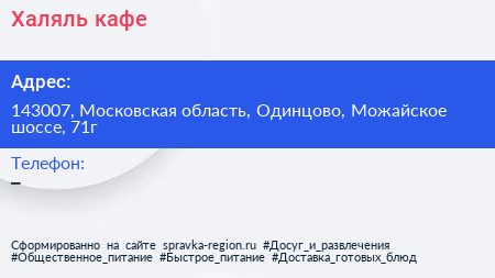 Халяль, кафе по адресу 143007, Московская область, Одинцово, Можайское шоссе, 71г в дальнейшем Организация, размещена в следующих категориях: