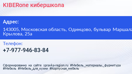 KIBERone, кибершкола по адресу 143005, Московская область, Одинцово, бульвар Маршала Крылова, 25а в дальнейшем Организация, размещена в следующих категориях: