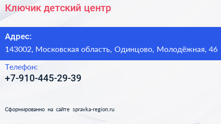 Ключик, детский центр по адресу 143002, Московская область, Одинцово, Молодёжная, 46 в дальнейшем Организация, размещена в следующих категориях:
