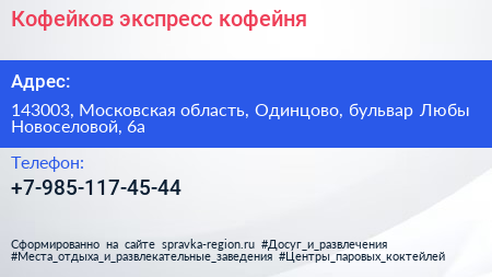 Кофейков, экспресс-кофейня по адресу 143003, Московская область, Одинцово, бульвар Любы Новоселовой, 6а в дальнейшем Организация, размещена в следующих категориях: