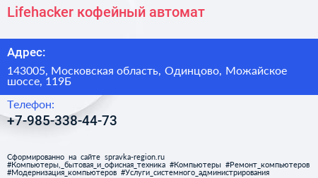 Lifehacker, кофейный автомат по адресу 143005, Московская область, Одинцово, Можайское шоссе, 119Б в дальнейшем Организация, размещена в следующих категориях: