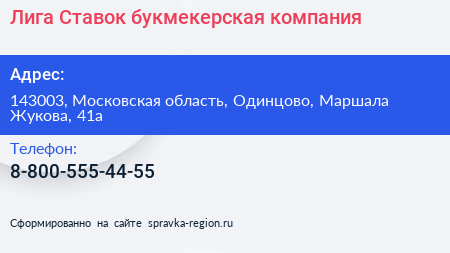 Лига Ставок, букмекерская компания по адресу 143003, Московская область, Одинцово, Маршала Жукова, 41а в дальнейшем Организация, размещена в следующих категориях: