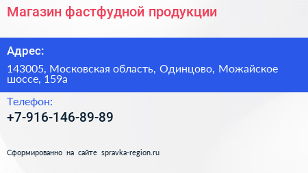Магазин фастфудной продукции по адресу 143005, Московская область, Одинцово, Можайское шоссе, 159а в дальнейшем Организация, размещена в следующих категориях: