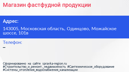Магазин фастфудной продукции по адресу 143005, Московская область, Одинцово, Можайское шоссе, 101в в дальнейшем Организация, размещена в следующих категориях: