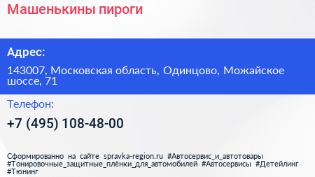 Машенькины пироги по адресу 143007, Московская область, Одинцово, Можайское шоссе, 71 в дальнейшем Организация, размещена в следующих категориях: