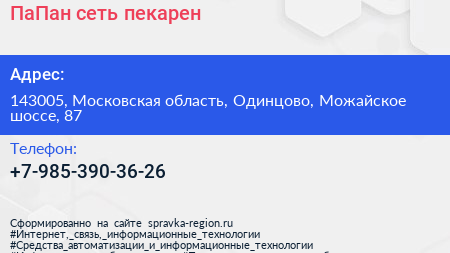 ПаПан, сеть пекарен по адресу 143005, Московская область, Одинцово, Можайское шоссе, 87 в дальнейшем Организация, размещена в следующих категориях: