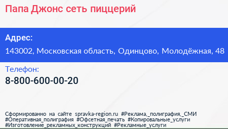 Папа Джонс, сеть пиццерий по адресу 143002, Московская область, Одинцово, Молодёжная, 48 в дальнейшем Организация, размещена в следующих категориях: