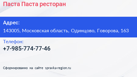 Паста-Паста, ресторан по адресу 143005, Московская область, Одинцово, Говорова, 163 в дальнейшем Организация, размещена в следующих категориях: