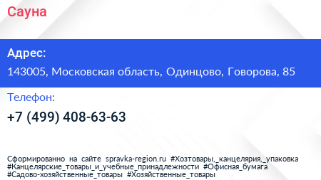 Сауна по адресу 143005, Московская область, Одинцово, Говорова, 85 в дальнейшем Организация, размещена в следующих категориях: