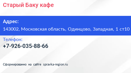 Старый Баку, кафе по адресу 143002, Московская область, Одинцово, Западная, 1 ст10 в дальнейшем Организация, размещена в следующих категориях:
