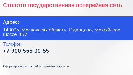 Столото, государственная лотерейная сеть по адресу 143005, Московская область, Одинцово, Можайское шоссе, 159 в дальнейшем Организация, размещена в следующих категориях: