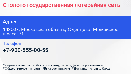 Столото, государственная лотерейная сеть по адресу 143007, Московская область, Одинцово, Можайское шоссе, 71 в дальнейшем Организация, размещена в следующих категориях: