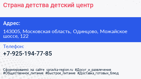 Страна детства, детский центр по адресу 143005, Московская область, Одинцово, Можайское шоссе, 122 в дальнейшем Организация, размещена в следующих категориях: