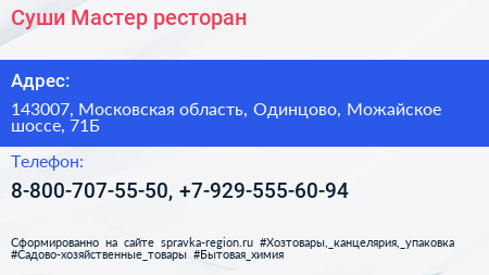Суши Мастер, ресторан по адресу 143007, Московская область, Одинцово, Можайское шоссе, 71Б в дальнейшем Организация, размещена в следующих категориях: