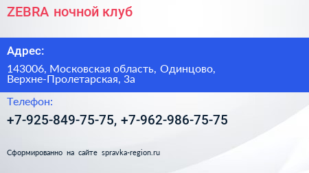 ZEBRA, ночной клуб по адресу 143006, Московская область, Одинцово, Верхне-Пролетарская, 3а в дальнейшем Организация, размещена в следующих категориях: