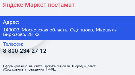 Яндекс.Маркет, постамат по адресу 143003, Московская область, Одинцово, Маршала Бирюзова, 28 к2 в дальнейшем Организация, размещена в следующих категориях: