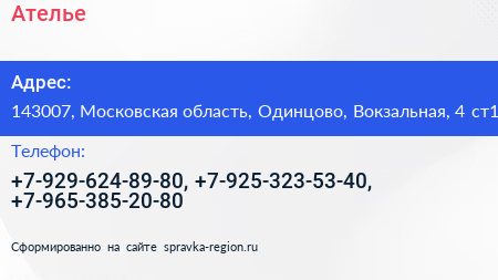 Ателье по адресу 143007, Московская область, Одинцово, Вокзальная, 4 ст1 в дальнейшем Организация, размещена в следующих категориях: