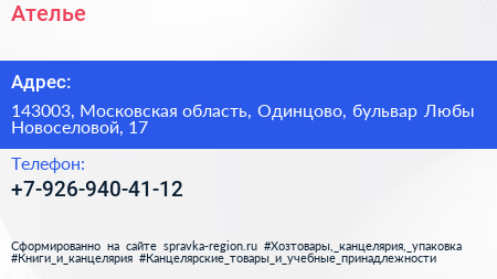 Ателье по адресу 143003, Московская область, Одинцово, бульвар Любы Новоселовой, 17 в дальнейшем Организация, размещена в следующих категориях: