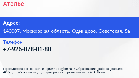 Ателье по адресу 143007, Московская область, Одинцово, Советская, 5а в дальнейшем Организация, размещена в следующих категориях: