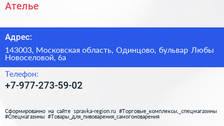 Ателье по адресу 143003, Московская область, Одинцово, бульвар Любы Новоселовой, 6а в дальнейшем Организация, размещена в следующих категориях: