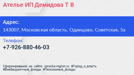 Ателье, ИП Демидова Т.В. по адресу 143007, Московская область, Одинцово, Советская, 5а в дальнейшем Организация, размещена в следующих категориях: