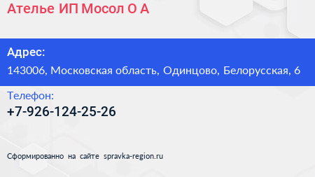 Ателье, ИП Мосол О.А. по адресу 143006, Московская область, Одинцово, Белорусская, 6 в дальнейшем Организация, размещена в следующих категориях: