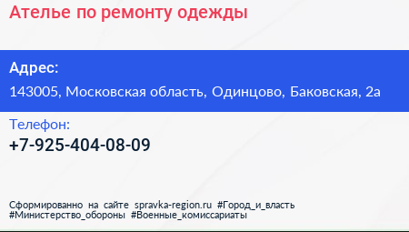 Ателье по ремонту одежды по адресу 143005, Московская область, Одинцово, Баковская, 2а в дальнейшем Организация, размещена в следующих категориях: