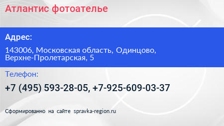 Атлантис, фотоателье по адресу 143006, Московская область, Одинцово, Верхне-Пролетарская, 5 в дальнейшем Организация, размещена в следующих категориях: