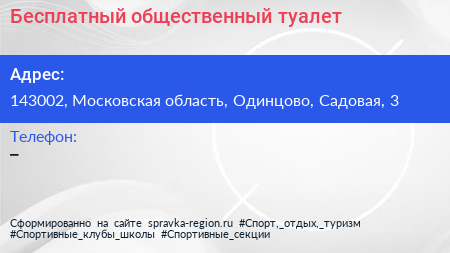 Бесплатный общественный туалет по адресу 143002, Московская область, Одинцово, Садовая, 3 в дальнейшем Организация, размещена в следующих категориях: