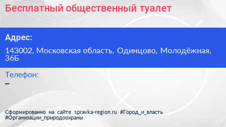 Бесплатный общественный туалет по адресу 143002, Московская область, Одинцово, Молодёжная, 36Б в дальнейшем Организация, размещена в следующих категориях: