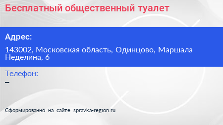 Бесплатный общественный туалет по адресу 143002, Московская область, Одинцово, Маршала Неделина, 6 в дальнейшем Организация, размещена в следующих категориях: