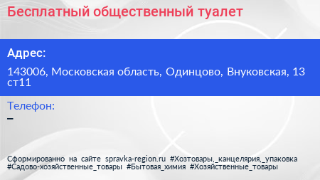Бесплатный общественный туалет по адресу 143006, Московская область, Одинцово, Внуковская, 13 ст11 в дальнейшем Организация, размещена в следующих категориях: