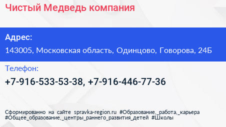 Чистый Медведь, компания по адресу 143005, Московская область, Одинцово, Говорова, 24Б в дальнейшем Организация, размещена в следующих категориях: