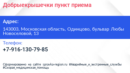 #Добрыекрышечки, пункт приема по адресу 143003, Московская область, Одинцово, бульвар Любы Новоселовой, 13 в дальнейшем Организация, размещена в следующих категориях: