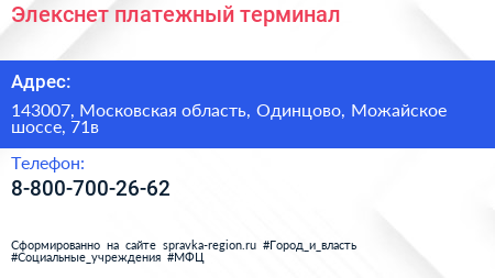 Элекснет, платежный терминал по адресу 143007, Московская область, Одинцово, Можайское шоссе, 71в в дальнейшем Организация, размещена в следующих категориях: