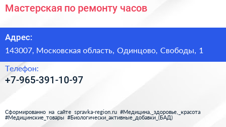 Мастерская по ремонту часов по адресу 143007, Московская область, Одинцово, Свободы, 1 в дальнейшем Организация, размещена в следующих категориях: