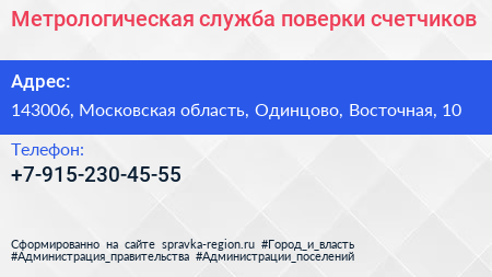 Метрологическая служба поверки счетчиков по адресу 143006, Московская область, Одинцово, Восточная, 10 в дальнейшем Организация, размещена в следующих категориях: