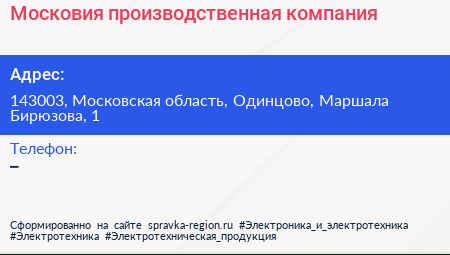 Московия, производственная компания по адресу 143003, Московская область, Одинцово, Маршала Бирюзова, 1 в дальнейшем Организация, размещена в следующих категориях:
