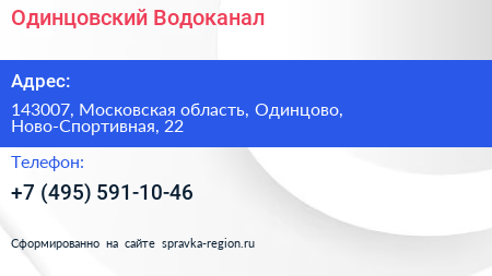 Одинцовский Водоканал по адресу 143007, Московская область, Одинцово, Ново-Спортивная, 22 в дальнейшем Организация, размещена в следующих категориях: