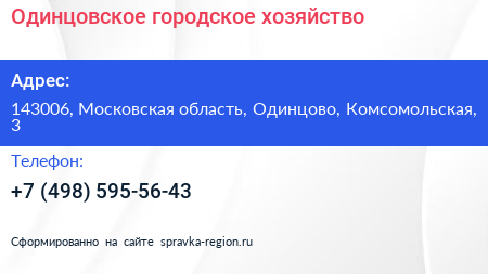 Одинцовское городское хозяйство по адресу 143006, Московская область, Одинцово, Комсомольская, 3 в дальнейшем Организация, размещена в следующих категориях: