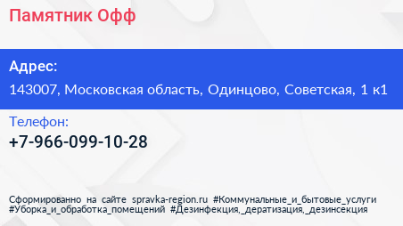 Памятник Офф по адресу 143007, Московская область, Одинцово, Советская, 1 к1 в дальнейшем Организация, размещена в следующих категориях: