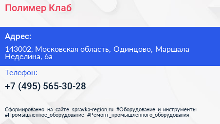 Полимер Клаб по адресу 143002, Московская область, Одинцово, Маршала Неделина, 6а в дальнейшем Организация, размещена в следующих категориях: