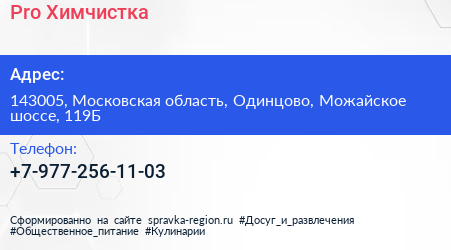 Pro Химчистка по адресу 143005, Московская область, Одинцово, Можайское шоссе, 119Б в дальнейшем Организация, размещена в следующих категориях: